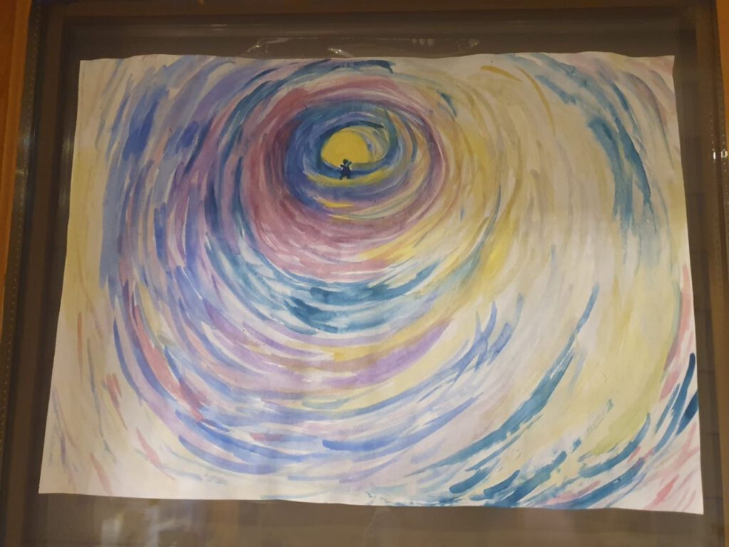 Lydia hat das Himmelstor, welches sich ihr als Dritter Durchgang gezeigt hat, künstlerisch festgehalten. Sie ist in drei Ebenen eingetreten. Erst ebenerdig, dann durch eine Falltüre nach unten, dann in ein Himmelstor. Dies waren Bilder die sich ihr so gezeigt haben. Meine Begleitung war darin, dass wir an einem Ort mit Türen, Toren, Eingängen sind. Beigleitet habe ich außerdem das Eintreten und Verabschieden dieser Räume. Jede Türe wurde ehrfürchtig geöffnet, mit Bitte um Einlass betreten und dankbar und mit Gaben von Helfern an diesem Ort verlassen und die Türe geschlossen. In schamanischen Kontexten wird oft auch von den verschiedenen Welten gesprochen. Die Unterwelt, Mittelwelt, Oberwelt. Hier gibt es leichte Unterschiede von z. B. slawischem oder nordamerikanischem Schamanismus, auch die antiken Weltbilder kannten die Unterwelt. Hier gibt es viele Kosmologische Verständnisse. Ich verschreibe mich keinem dieser Weltbilder. Wir reisen im Seelenreich der einzelnen Person und stehen unter Schutz unserer geistigen Teams.
